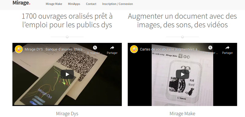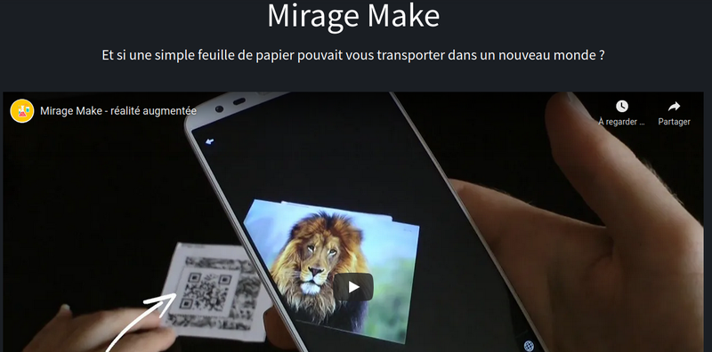 Plateforme n°1 de réalité augmentée et virtuelle pour le numérique éducatif : Et si une simple feuille de papier pouvait avoir une troisième dimension ... virtuelle ? Le projet d'application Mirage Make, c'est tout simplement permettre à tous de créer sa propre réalité augmentée. Mirage Make s'adresse à tous ceux qui désirent augmenter une présentation, un document de travail ou une maquette de projet, et particulièrement au monde de l'éducation, enseignants ou élèves, qui pourront créer des productions valorisées par la réalité augmentée. Celle-ci créé une dynamique de motivation auprès des élèves qui pourront produire facilement des documents captivants.