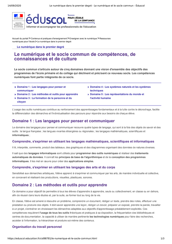 Ce document rassemble les extraits des programmes de l'école primaire qui font explicitement référence aux usages du numérique au service des apprentissages et de la construction des compétences et des connaissances. Il est actualisé avec les ajustements apportés pour la rentrée 2018 aux programmes scolaires de français, mathématiques et enseignement moral et civique. Ces ajustements donnent au cycle 2 une place centrale à la maîtrise des langages, et notamment de la langue française. Au cycle 3, ils mettent l'accent sur la consolidation de l'acquisition des savoirs fondamentaux (lire, écrire, compter, respecter autrui) et sur la continuité et la progressivité pédagogiques entre l'école primaire et le collège.